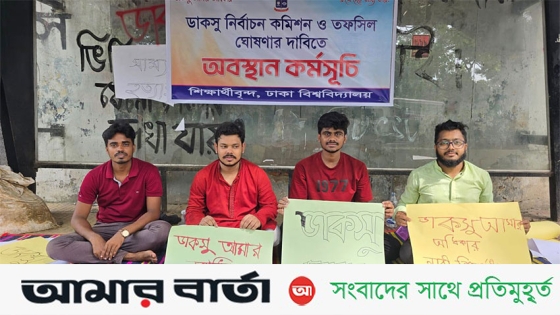 ঢাকা বিশ্ববিদ্যালয় ছাত্র সংসদ নির্বাচনের (ডাকসু) নির্বাচন কমিশন ও তফসিল ঘোষণার দাবিতে অবস্থান কর্মসূচি পালন করছে ঢাকা বিশ্ববিদ্যালয়ের (ঢাবি) একদল শিক্ষার্থী।