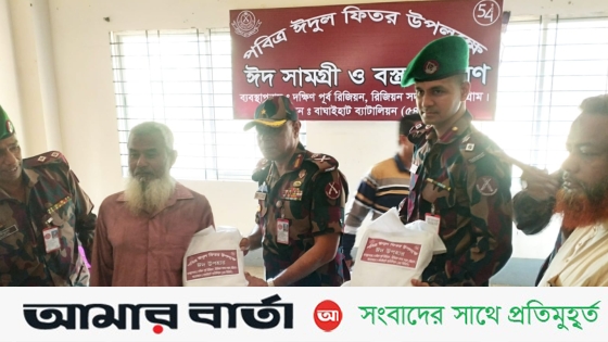 পবিত্র ঈদুল ফিতর উপলক্ষে বিজিবির দক্ষিণ পূর্ব রিজিয়নের ব্যবস্থাপনায় এবং বাঘাইহাট ব্যাটালিয়ন (৫৪ বিজিবি) এর আয়োজনে রাঙ্গামাটির বাঘাইছড়ি উপজেলার সাজেক ইউনিয়নের বাঘাইহাট এলাকায় শতাধিক অসহায় মুসলিম পরিবারের মাঝে ঈদ সামগ্রী ও বস্ত্র বিতরণ করেছে ৫৪ বিজিবি বাঘাইহাট ব্যাটালিয়ন। ২৩ মার্চ রবিবার দুপুর ১২০০ ঘটিকায় সাজেক ইউনিয়ন পরিষদের হলরুমে এসব ঈদ সামগ্রী ও বস্ত্র বিতরণ করেন বিজিবির দক্ষিণ পূর্ব রিজিয়নের রিজিয়ন কমান্ডার অতিরিক্ত মহাপরিচালক ব্রিগেডিয়ার জেনারেল আবুল হাসনাৎ মোঃ শাহরিয়ার ইকবাল। এসময় ৫৪ বিজিবি বাঘাইহাট ব্যাটালিয়নের অধিনায়ক লেঃ কর্নেল মহিউদ্দিন ফারুকী উপস্থিত ছিলেন।