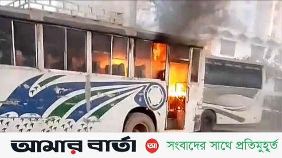 পুলিশ জানায়, রাতের আধারে এমসি বাজার এলাকায় দাঁড়িয়ে থাকা একটি শ্রমিক বাসে আগুন দেয় দুর্বৃত্তরা।