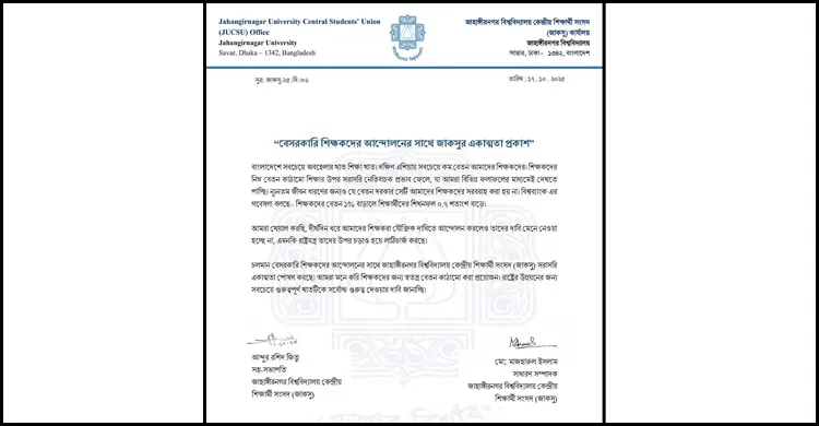 চলমান এমপিওভুক্ত শিক্ষকদের আন্দোলনের প্রতি সংহতি জানিয়ে একাত্মতা প্রকাশ করেছে জাহাঙ্গীরনগর বিশ্ববিদ্যালয় কেন্দ্রীয় শিক্ষার্থী সংসদ