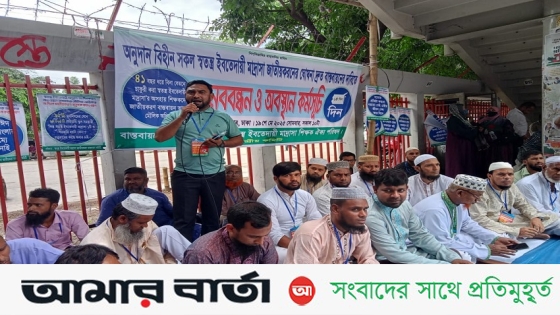 সকল স্বতন্ত্র ইবতেদায়ি মাদ্রাসা পর্যায়ক্রমে জাতীয়করণে সরকারের ঘোষণা দ্রুত বাস্তবায়নের দাবিতে ১৯তম দিনের মতো অবস্থান কর্মসূচি পালন করছেন শিক্ষকরা।