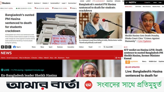 গণ-অভ্যুত্থানের মাধ্যমে ক্ষমতাচ্যুত সাবেক প্রধানমন্ত্রী শেখ হাসিনাকে মৃত্যুদণ্ড দিয়েছেন আন্তর্জাতিক অপরাধ ট্রাইব্যুনাল-১। শেখ হাসিনার মৃত্যুদণ্ডের খবরটি বেশ গুরুত্ব দিয়ে প্রকাশ করেছে আন্তর্জাতিক গণমাধ্যমগুলো। পশ্চিমা বিশ্বের গণমাধ্যম থেকে শুরু করে ভারতসহ দক্ষিণ এশিয়ার বিভিন্ন দেশের গণমাধ্যম এই বিষয়ে আজ সোমবার প্রধান খবর প্রকাশ করেছে।