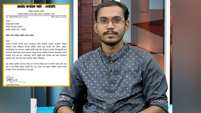 বুধবার (২১ মে) সকালে তাকে এনসিপির যুগ্ম সদস্যসচিব (দপ্তর) সালেহ উদ্দিন সিফাত স্বাক্ষরিত এ নোটিশ পাঠানো হয়েছে।