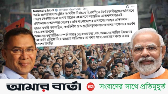 মো‌দি ব‌লেন, এই বিজয় আপনার (তা‌রেক রহমান) নেতৃত্বের প্রতি বাংলাদেশের জনগণের আস্থার পরিচয় দেয়। ভারত একটি গণতান্ত্রিক, প্রগতিশীল এবং অন্তর্ভুক্তিমূলক বাংলাদেশের সমর্থনের সঙ্গে থাক‌বে।