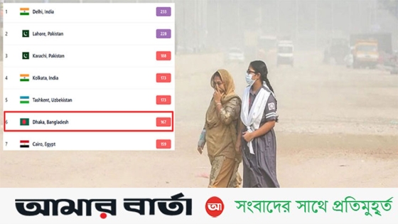 বিশ্বের দূষিত বাতাসের শহরের তালিকায় ষষ্ঠ অবস্থানে রয়েছে রাজধানী ঢাকা, যার স্কোর ১৬৭। এই স্কোর বাতাসের মানকে ‘সংবেদনশীল গোষ্ঠীর জন্য অস্বাস্থ্যকর’ বলে নির্দেশ করে।