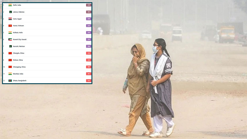 সারা বিশ্বের মধ্যে সবচেয়ে দূষিত বাতাসের শহরের তালিকায় শীর্ষে উঠে এসেছে ভারতের রাজধানী শহর দিল্লি, স্কোর ৪৭৯ যা ‘দুর্যোগপূর্ণ’। আর এ তালিকায় বাংলাদেশের রাজধানী ঢাকা রয়েছে দ্বাদশ অবস্থানে, যার স্কোর ১৫৩, যা ‘অস্বাস্থ্যকর’ বলে বিবেচিত।