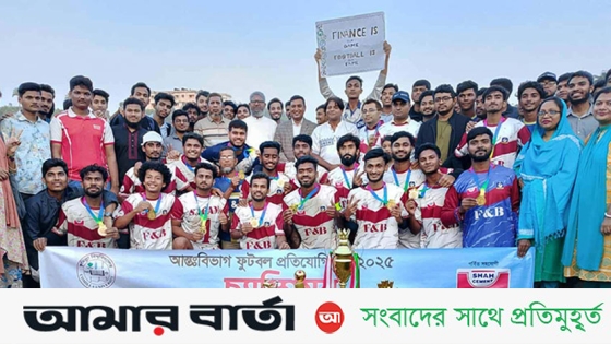 কুমিল্লা বিশ্ববিদ্যালয়ের আন্তঃবিভাগ ফুটবল টুর্নামেন্ট-২০২৫ এর ফাইনাল ম্যাচে টাইব্রেকারে লোক প্রশাসন বিভাগকে ৩-২ গোলে হারিয়ে চ্যাম্পিয়ন হয়েছে ফিন্যান্স এন্ড ব্যাংকিং বিভাগ।
