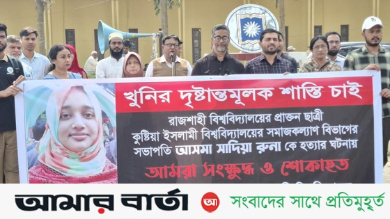 রাজশাহী বিশ্ববিদ্যালয়ের (রাবি) সাবেক শিক্ষার্থী ও ইসলামী বিশ্ববিদ্যালয়ের (ইবি) সমাজকল্যাণ বিভাগের সভাপতি আসমা সাদিয়া রুনা হত্যাকাণ্ডের বিচার চেয়ে মানববন্ধন করেছে রাজশাহী বিশ্ববিদ্যালয়ের সমাজকর্ম বিভাগের শিক্ষক ও শিক্ষার্থীরা।