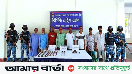 ভোলায় ১ টি আগ্নেয়াস্ত্র এবং বিপুল পরিমাণ দেশীয় অস্ত্রসহ ৮ জন দুর্ধর্ষ ডাকাতকে আটক করেছে কোস্ট গার্ড