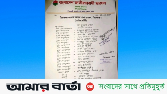সিরাজগঞ্জ সরকারি কলেজ শাখা জাতীয়তাবাদী ছাত্রদলের নবগঠিত আহ্বায়ক কমিটি ঘোষণা করা হয়েছে। শুক্রবার (২৬ সেপ্টেম্বর ২০২৫) সিরাজগঞ্জ জেলা ছাত্রদলের সভাপতি জুনায়েদ আহমেদ সবুজ ও সাধারণ সম্পাদক সিরাজুল ইসলাম (সেরাজ) স্বাক্ষরিত এক বিজ্ঞপ্তিতে এ কমিটি ঘোষণা করা হয়।