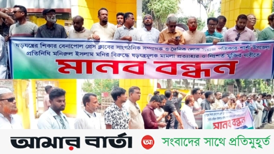 রোববার (২৮ সেপ্টেম্বর) সকাল ১১টায় শার্শা উপজেলা পরিষদের সামনে আয়োজিত মানববন্ধনে সাংবাদিক সমাজের নেতৃবৃন্দ ছাড়াও বিভিন্ন প্রেসক্লাবের শতাধিক সাংবাদিক অংশ নেন।