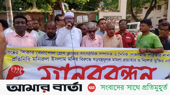যশোরের শার্শা উপজেলা প্রতিনিধি ও দৈনিক লোকসমাজ পত্রিকার সাংবাদিক মনিরুল ইসলাম মনি’র বিরুদ্ধে দায়েরকৃত ষড়যন্ত্রমূলক ও হয়রানিমূলক মামলা প্রত্যাহার এবং তার নিঃশর্ত মুক্তির দাবিতে বেনাপোলে মানববন্ধন কর্মসূচি পালন করেছেন যশোর ও শার্শা উপজেলার সাংবাদিকরা।