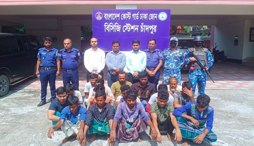 চাঁদপুরে মেঘনা নদীর মোহনায় অবৈধ কারেন্ট জাল ও ২ টি বোটসহ ১৭ জন জেলেকে আটক