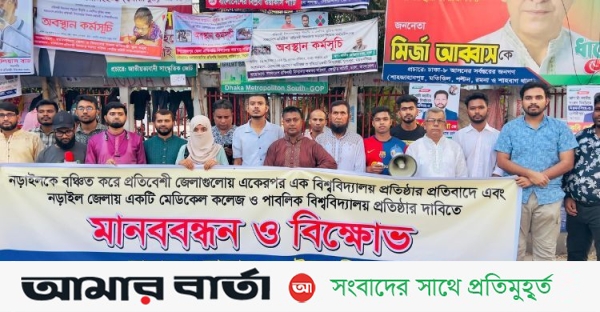 নড়াইলকে বঞ্চিত করে আশপাশের জেলায় একাধিক বিশ্ববিদ্যালয় প্রতিষ্ঠার প্রতিবাদে এবং নড়াইলে মেডিকেল কলেজ ও বিশ্ববিদ্যালয় প্রতিষ্ঠার দাবিতে ঢাকায় মানববন্ধন ও বিক্ষোভ হয়েছে।