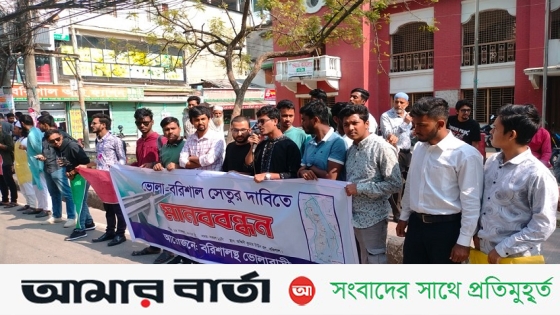 ভোলা-বরিশাল সেতুর দাবিতে আজ সোমবার বরিশাল নগরীতে মানববন্ধন করেছেন শিক্ষার্থীরা। বরিশালে ভোলাবাসীর আয়োজনে দুপুর ১২টায় অশ্বিনীকুমার টাউন হলের সামনে এ মানববন্ধন ও সমাবেশ হয়।
