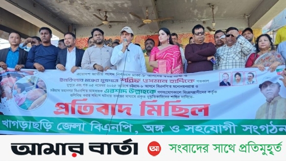 আসন্ন ত্রয়োদশ জাতীয় সংসদ নির্বাচনে ঢাকা-৮ আসনের স্বতন্ত্র প্রার্থী ও ইনকিলাব মঞ্চের মুখপাত্র শরিফ ওসমান হাদি ওপর সন্ত্রাসীদের নৃশংস হামলার প্রতিবাদে খাগড়াছড়িতে বিক্ষোভ মিছিল ও সমাবেশ করেছে জেলা বিএনপি।