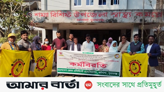 বাংলাদেশ হেলথ অ্যাসিস্ট্যান্ট অ্যাসোসিয়েশনের উদ্যোগে ছয় দফা দাবি বাস্তবায়নের লক্ষ্যে সুনামগঞ্জের ধর্মপাশা উপজেলায় অবস্থান কর্মসূচি ও কর্মবিরতি পালন করা হয়েছে।