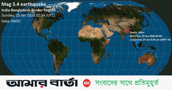 বাংলাদেশ আবহাওয়া অধিদপ্তরের আবহাওয়া অফিস সহকারী গোলাম মোস্তফা জানান, সকাল ৮টা ৩৪ মিনিটে ৩ দশমিক ৪ মাত্রার মৃদু ভূমিকম্প অনুভূত হয়েছে। ঢাকা থেকে ৩৩১ কিলোমিটার দূরে এবং ভূপৃষ্ঠ থেকে ১০ কিলোমিটার গভীরে ভূমিকম্পটির উৎপত্তিস্থল ছিল।