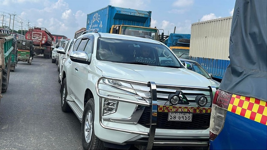ঢাকা-সিলেট মহাসড়কের ব্রাহ্মণবাড়িয়ার অংশ পরিদর্শনে এসে যানজটে আটকা পড়া সড়ক ও সেতু মন্ত্রণালয়ের উপদেষ্টা ফাওজুল কবির খান অবশেষে মোটরসাইকেলে চড়ে