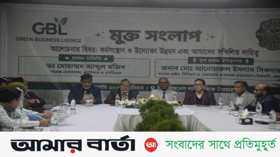 আজ ১০ জানুয়ারি শনিবার রাজধানীর পুরানা পল্টনস্থ বি.কে টাওয়ারে ‘কর্মসংস্থান ও উদ্যোক্তা উন্নয়ন এবং আমাদের সম্মিলিত দায়িত্ব’ শীর্ষক এক মুক্ত আলোচনা সভায় প্রধান অতিথির বক্তব্যে তিনি এসব কথা বলেন। গ্রীন কমিউনিটি এন্ট্রাপ্রেনিয়র ক্লাব লিমিটেড ও গ্রীন বিজনেস লাউঞ্জ যৌথভাবে এই সংলাপের আয়োজন করে।
