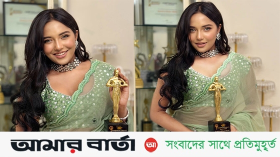 হালকা সবুজ শাড়িতে তাঁর উপস্থিতি ছিল স্বচ্ছ, মার্জিত এবং প্রাণবন্ত। পুরস্কার হাতে দর্শকদের অভিবাদনের জবাবে তিনি যখন টিমটিমে আলো আর করতালির ভেতর দিয়ে এগিয়ে আসছিলেন, তখন তার উচ্ছ্বাস যেন মঞ্চের আবহে এক মুহূর্তের উষ্ণতা ছড়িয়ে দেয়। হৈচৈহীন, তবে হৃদয়ের গভীর থেকে উঠে আসা সেই হাসি অনুষ্ঠানটিকে আরও উজ্জ্বল ও জীবন্ত করে তোলে।