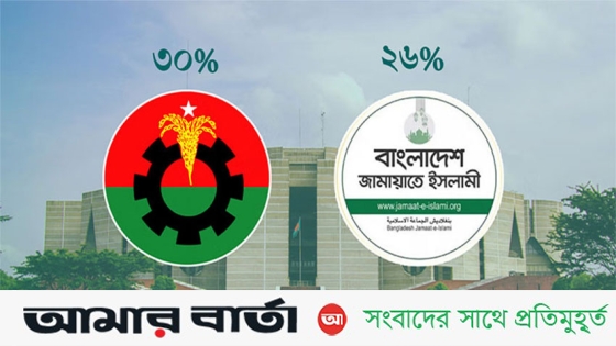 আগামী সপ্তাহে জাতীয় সংসদ নির্বাচন অনুষ্ঠিত হলে ৩০ শতাংশ ভোটার বাংলাদেশ জাতীয়তাবাদী দল-বিএনপিকে ভোট দেবেন। জামায়াতে ইসলামীকে ভোট দেবেন ২৬ শতাংশ ভোটার। অর্থাৎ দুই দলের মধ্যে ব্যবধান মাত্র ৪ শতাংশ। মার্কিন ফেডারেল সরকারের অর্থায়নে রিপাবলিকান পার্টি-ঘনিষ্ঠ অলাভজনক প্রতিষ্ঠান ইন্টারন্যাশনাল রিপাবলিকান ইনস্টিটিউটের (আইআরআই) এক জরিপের ভিত্তিতে এই তথ্য জানিয়েছে।