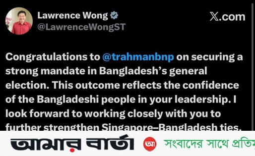 এক্স পোস্টে সিঙ্গাপুরের প্রধানমন্ত্রী লরেন্স ওং বলেন, বাংলাদেশের সাধারণ নির্বাচনে শক্তিশালী জনসমর্থন অর্জনের জন্য তারেক রহমানকে অভিনন্দন। এই ফলাফল তাঁর নেতৃত্বের প্রতি বাংলাদেশের জনগণের আস্থার প্রতিফলন।