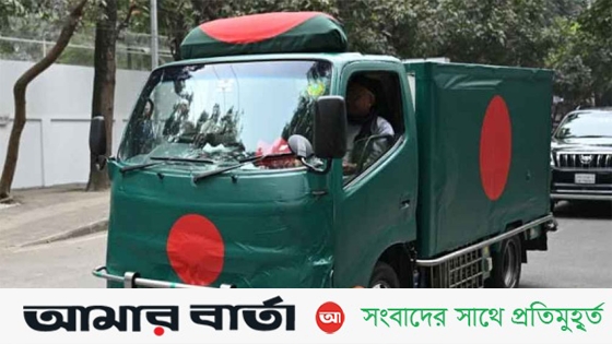 বিএনপি চেয়ারপারসন ও সাবেক প্রধানমন্ত্রী খালেদা জিয়ার মরদেহ জাতীয় পতাকায় মোড়ানো একটি গাড়িতে করে গুলশান থেকে জানাজার জন্য মানিক মিয়া অ্যাভিনিউয়ে নেওয়া হচ্ছে।