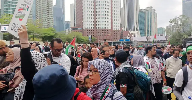 কুয়ালালামপুরে শুক্রবার সকাল থেকেই টানা বৃষ্টি চললেও তা আটকাতে পারেনি ইসরায়েল-বিরোধী সমাবেশে অংশ নেওয়া হাজারো মানুষকে। জুমার নামাজ শেষে রাজধানীর তাবুং হাজি ভবনের সামনে বিশিষ্ট বক্তাদের বক্তব্যের পর জনতা মার্কিন দূতাবাসের দিকে মিছিল করে। স্লোগানে মুখরিত এই মিছিল গাজার মানুষের প্রতি সংহতি প্রকাশ করে এবং ইসরায়েলের আগ্রাসনের তীব্র নিন্দা জানায়।