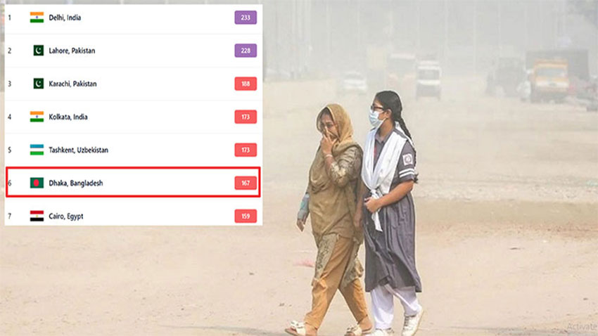 পঞ্চম অবস্থানে ঢাকা এবং ঢাকার দূষণ স্কোর ১৭২ অর্থাৎ এখানকার বাতাসও অস্বাস্থ্যকর।